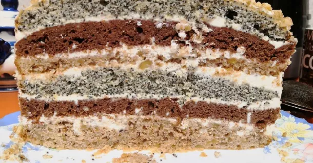 Mix sugar, sour cream, eggs and soda thoroughly, add whipped butter and flour. Divide the finished dough into three parts - add raisins in one part, nuts in the second, cocoa in the third. Bake three tortillas, chill. Then cut each cake lengthwise. A total of 6 cakes are obtained.