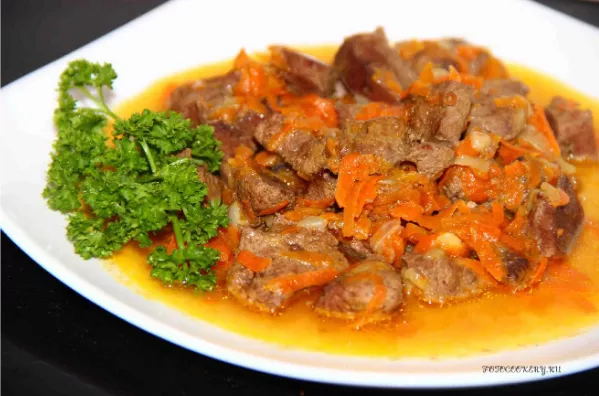 Finely chop the onion and fry in vegetable oil. Cut the carrots into strips and add to the onion. Then cut the liver into cubes, salt and fry with onions and carrots on all sides. Cover and simmer until tender. The liver is ready when clear juice is released when pierced with a knife.