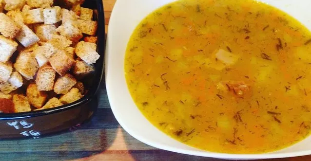 Beef with bone, preferably brisket, pour cold water, bring to a boil, remove noise, reduce heat and cook until half cooked. Then add the peeled carrots, onions and parsley. At the same time, pour the washed peas in a small saucepan with water and cook them over low heat, stirring occasionally. When the peas are tender, put them in the soup and cook for another ten minutes. Then add salt, herbs and boil. Pea soup is served with croutons made from white bread, diced and dried in the oven or fried in a pan with butter.
