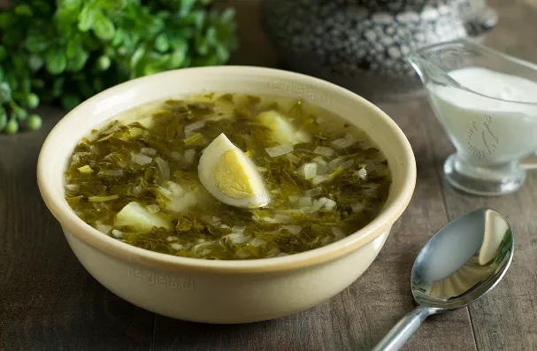 Put onion and carrots in boiling water, after ten minutes, diced potatoes. At the same time sort the sorrel, rinse, cut off the stems, finely chop the leaves. When the potatoes are boiled, add salt, sorrel and herbs and boil. Refrigerate. When serving, put finely chopped green onions and half an egg on a plate.