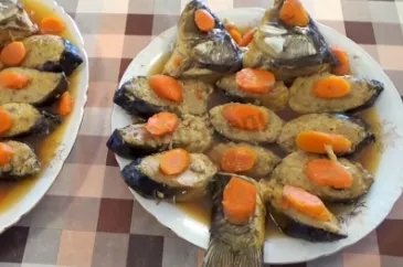 Peel the carp from the scales, cut off the head and, without cutting the abdomen, remove the insides, remove the gills from the head, rinse with cold water and cut the fish into transverse pieces, 3-5 cm thick. Cut the flesh from each piece of fish without damaging the skin. To prepare the minced meat, grind the pulp together with onions and bread soaked in water and squeezed out in a food processor. Add a raw egg, sugar, vegetable oil, pepper, salt to the minced meat and mix everything thoroughly. Fill the pieces of fish with the prepared minced meat in the places where the flesh was cut out, and level with a knife dipped in water. At the bottom of the pan, put beets and carrots cut into pieces, as well as thoroughly washed onion skins. On top of the vegetables, place the stuffed pieces of fish, on which put another layer of vegetables, then again the fish and again a layer of vegetables. Pour the fish and vegetables with cold water so that the water only covers them, and, having closed the pan, put it on low heat for 1.5 - 2 hours from the moment the water boils. During cooking, it is necessary to ensure that the fish and vegetables do not burn, the top layer of the fish should be occasionally watered with the resulting broth. Before serving, transfer the fish together with vegetables to a dish, strain the remaining broth and pour over the fish. Put in the refrigerator so that the broth is gelatinous.