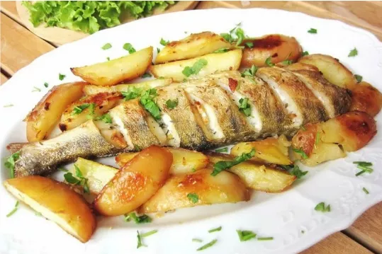 Baked pike perch with potatoes