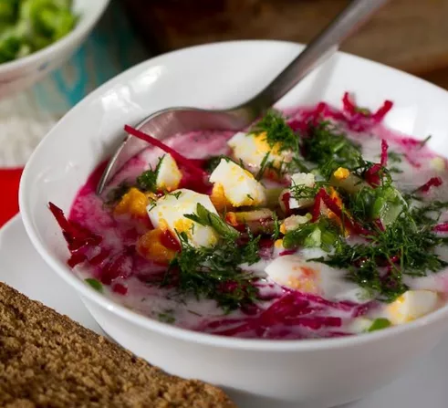 Put peeled beets, onions, carrots in boiling water. Cook until tender. Remove the beets and grate them on a coarse grater. In 10 minutes. add diced potatoes until the end of cooking. Before the end of cooking, add salt, herbs, grated beets and citric acid to taste. Cool, add finely chopped cucumber and half an egg to a plate when serving.