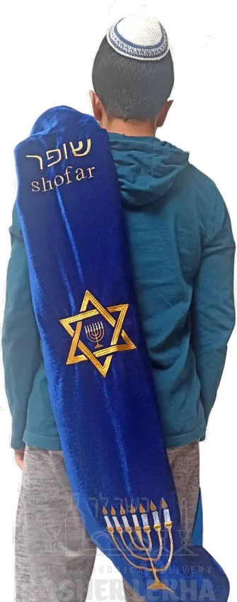 Embroidered shofar bag with a menorah and Star David pattern and the word shofar in Hebrew #2