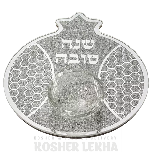 Glass plate in the shape of a pomegranate for serving apples in honey with a honey bowl on the bottom 5x19x23 cm