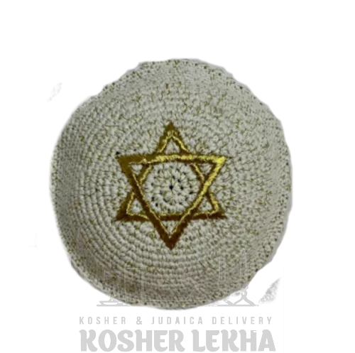 White kippah with gold star and gold thread, diameter 17cm